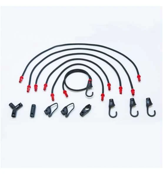 Ein Set besteht aus sechs Bungees plus neun Haken und Beutel.