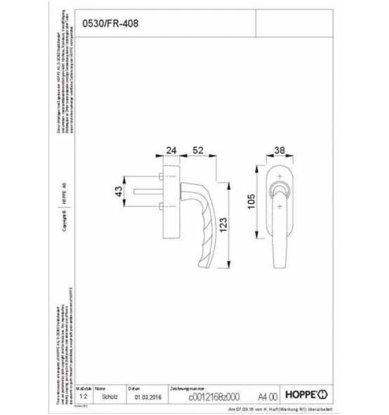 HOPPE- eFenstergriff SecuSignal® Aluminium-Dreh-/Kipp-Funk-Fenstergriff mit Secustik® und VarioFit®: Rastung: 90° · Abdeckung: Voll-Abdeckkappe · Unterkonstruktion: Kunststoff, Stütznocken · Stift: HOPPE-Vollstift, 10 mm Längenvariabilität (32-42mm), stufenlose Anpassung durch integrierte Druckfeder im Griffhals · Befestigung: verdeckt, Gewindeschrauben M5 · Temperaturbereich: Lagerung -20 °C bis +65 °C, Betrieb +5 °C bis +40 °C · Relative Luftfeuchtigkeit: max. 80 %, nicht kondensierend · Funk-Protokoll: EnOcean EEP F6-10-00 · Funk-Frequenz: 868 MHz · Übertragungsrate: 120 kbps +/-5 % · Übermittelte Informationen: Griffstellung (geöffnet/gekippt/geschlossen) · Sendeleistung: max. 10mW EIRP · Funk-Reichweite: gemäß EnOcean-Spezifikation max. 30 m, abhängig von der Gebäudebeschaffenheit · Stromversorgung: batterielos, über Energy Harvesting Weitere technische Eigenschaften: · Grifflänge: 123mm · Nocken-Ø: 10mm · Lochabstand: 52mm · Sockelstärke: 24mm · Anschlagrichtung: DIN links / rechts · Vierkant: 7mm